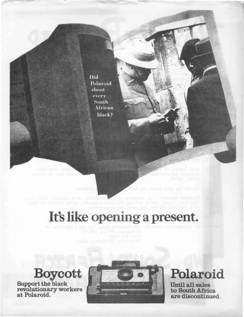 Flyer Boycott polaroid until all sales to South Africa are discontinued, The Research Group for the Liberation of Portuguese Africa, California, 1971