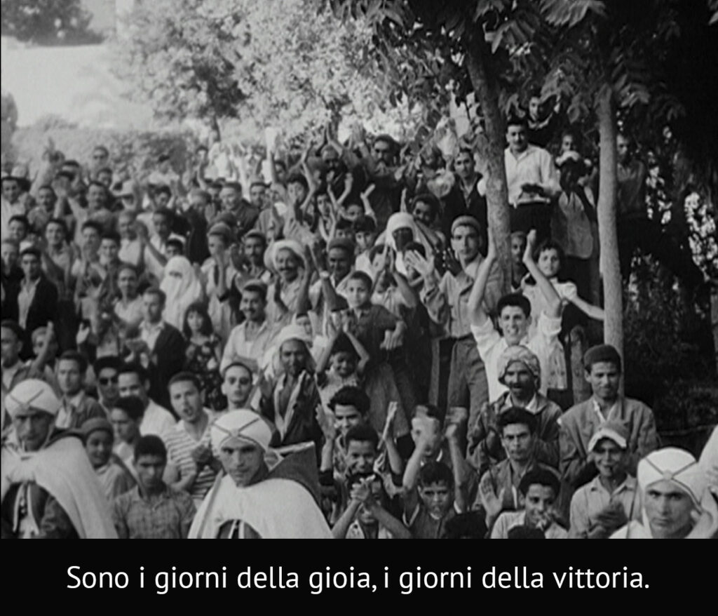 A sun-drenched composition where the central image of joyful children at the sea (children of Italian colonists in Libya) intertwines with a photograph of W.E.B. Du Bois—the American Pan-Africanist intellectual who wrote about the Italian invasion of Ethiopia as the “last great effort of white Europe secure the subjection of black men.” Giorgio Marincola, the Italian Black partisan as a child on horseback, leads us through two frames from Pier Paolo Pasolini’s Anger (1963), which the director realised during the era of Third World national liberation from European domination, and towards pamphlets of self-emancipation struggles.
