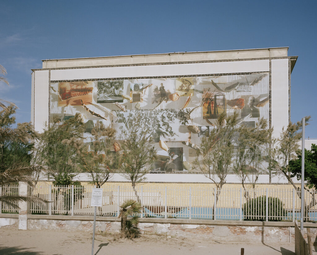 Arranging fragments of memory from across geographies, moments in history, and medium, the artwork Sun Baths offers the viewer a multiplicity of connecting paths between the Villa Marina colony in Pesaro, Italy’s overseas colonialism, and the ever-relevant racial question.