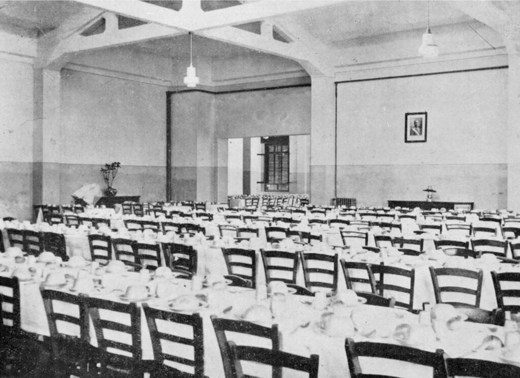 Il refettorio (in grado di contenere 500 persone) della Colonia Villa Marina, Pesaro. Fonte: Istituto di Assicurazione e Previdenza per i Postelegrafonici (1932), Villa Marina XXVIII Ottobre Pesaro. Estate MCMXXXII A. X. Ristampato da Stamperia Melchiorri Pesaro, 2020